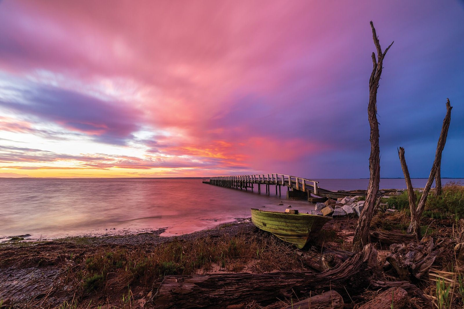 This Grantville Glow fine art print captures warm pastels sweeping across Western Port, where calm water and driftwood foreground details create a serene coastal scene. The colours and texture evoke the quiet transition of day into evening along Victoria’s Bass Coast.